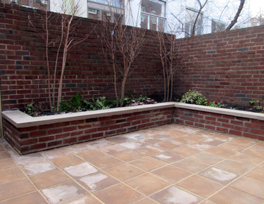 Construction is now complete for an elegant walled garden in the Washington Square West neighborhood of Philadelphia. The narrow property has been enhanced by the construction of a new brick wall with gate, built-in planters and cedar seating. A combination of flagstone and brick surfacing was employed to make a durable intimate space.