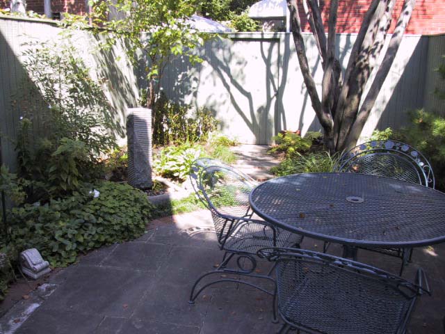 Composite to redesign their backyard with a simple desire: give us a restful place for quiet breakfasts and dinners. Composite landscape architect Michael LoFurno devised a plan that removed the rotting railroad ties and ground level deck, removed the level changes to make the space seem larger, and swapped angles for curves.